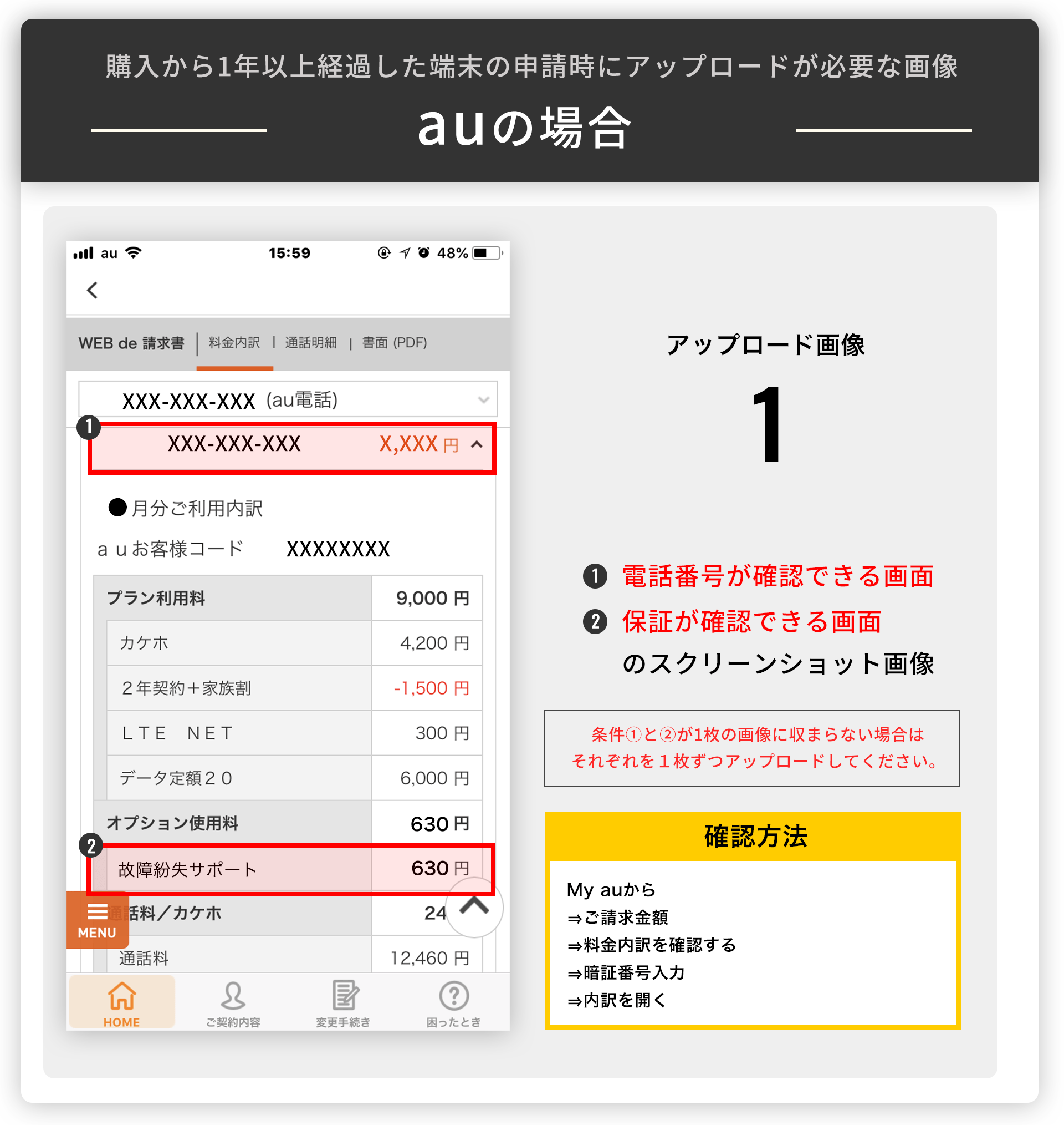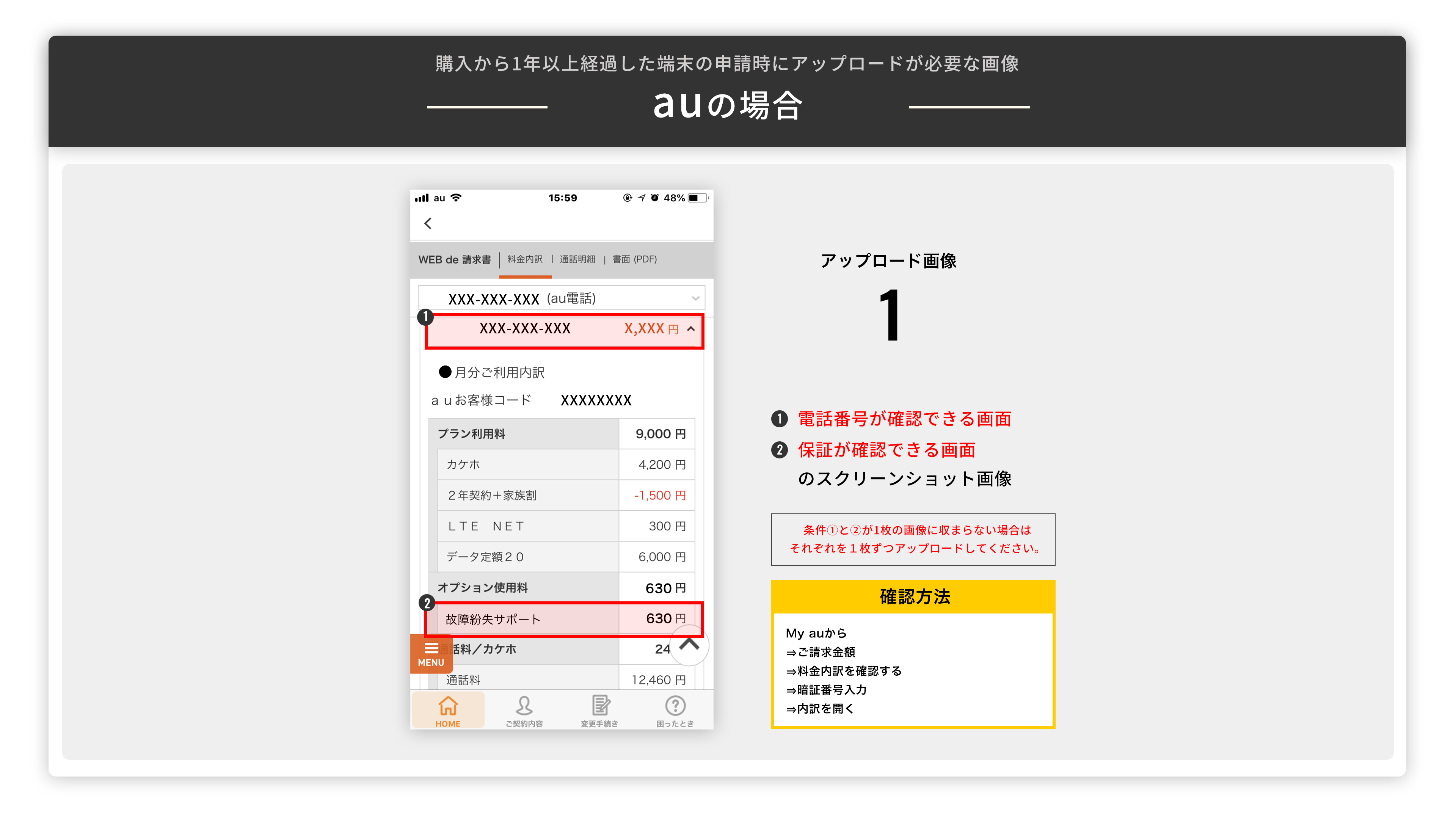 1. My auへログイン⇒スマホ・携帯電話⇒ご契約内容/手続き⇒お手続き履歴の確認 ⇒該当の契約書を選択