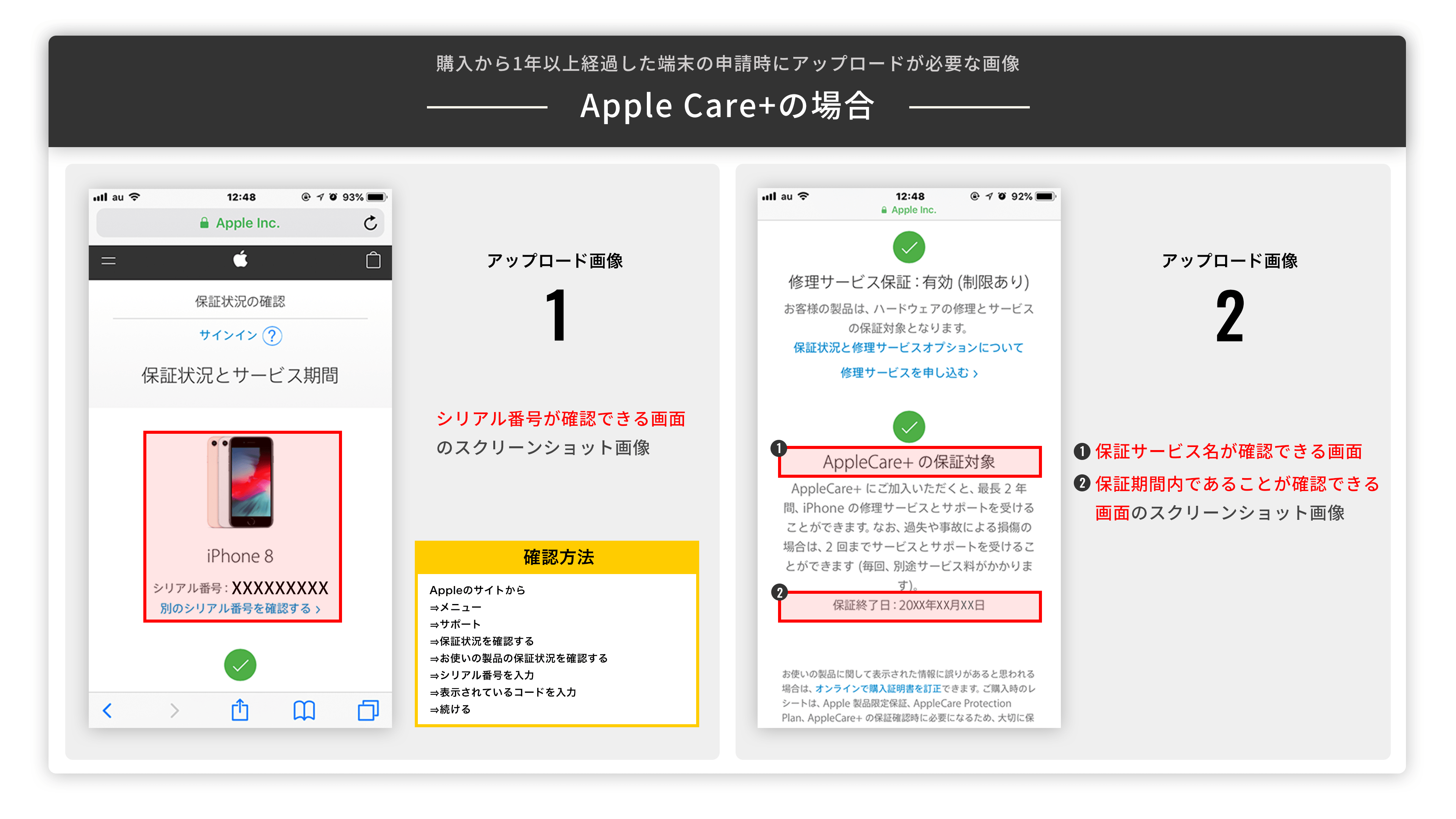 当保険は新規取得から1年未満の端末でかつ、お申込み時点で破損などなく全機能が正常に動作するものを補償いたします。購入日を購入証明書にて確認いたしますので以下の内容を確認のうえ登録してください。