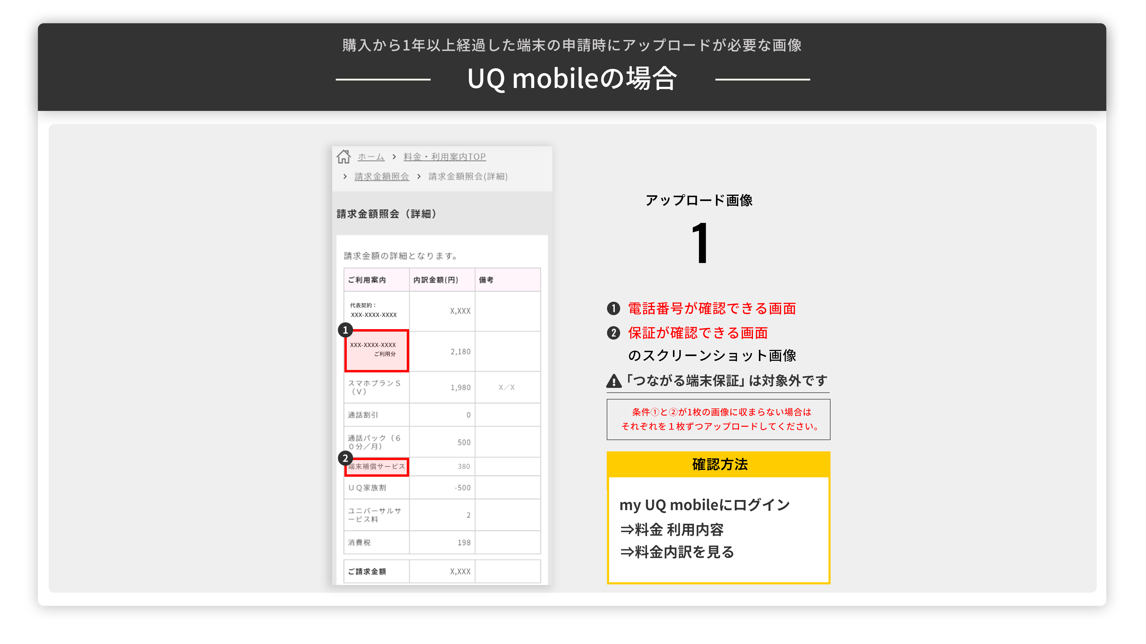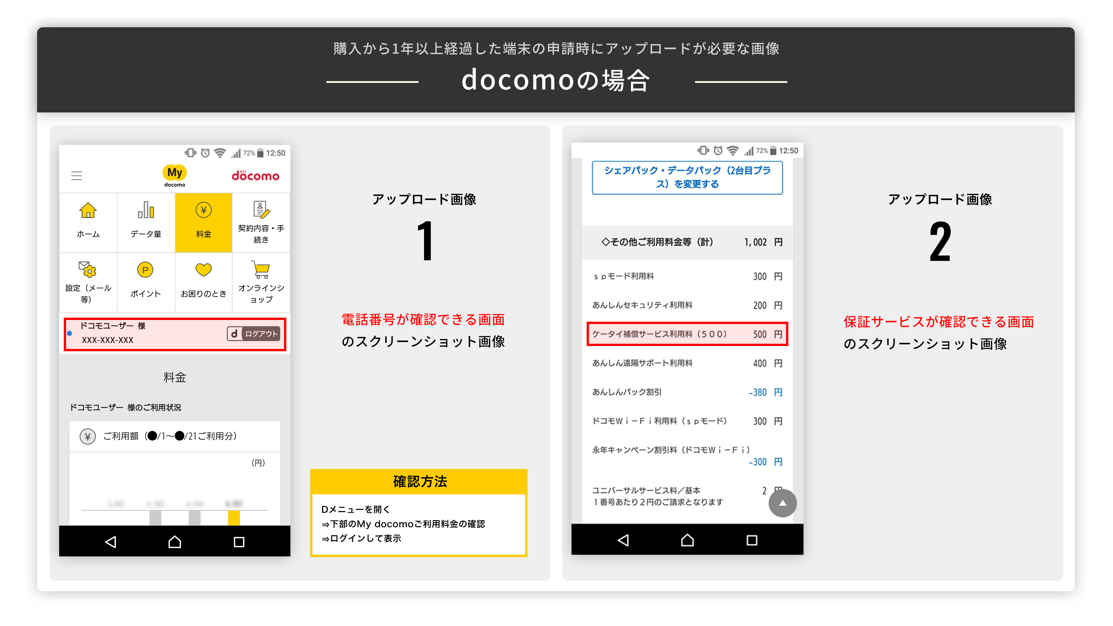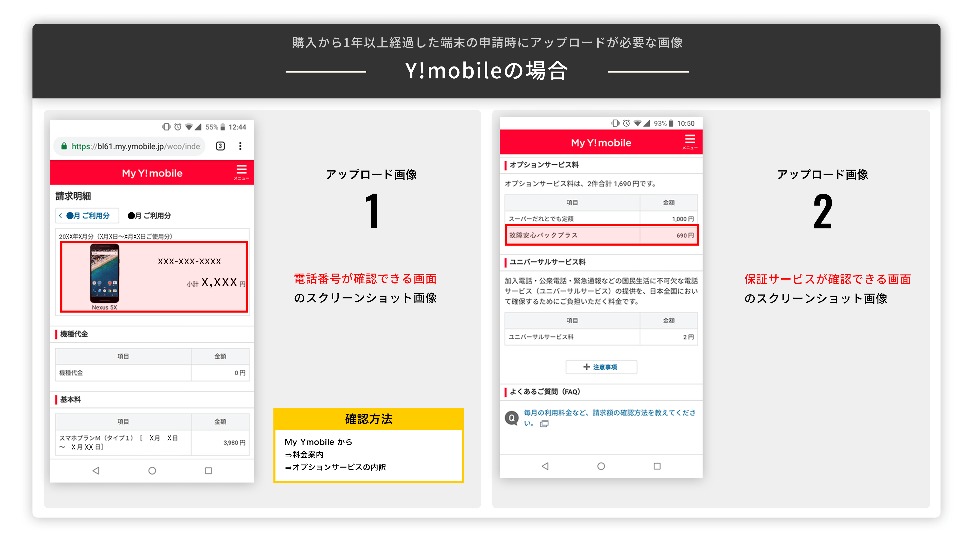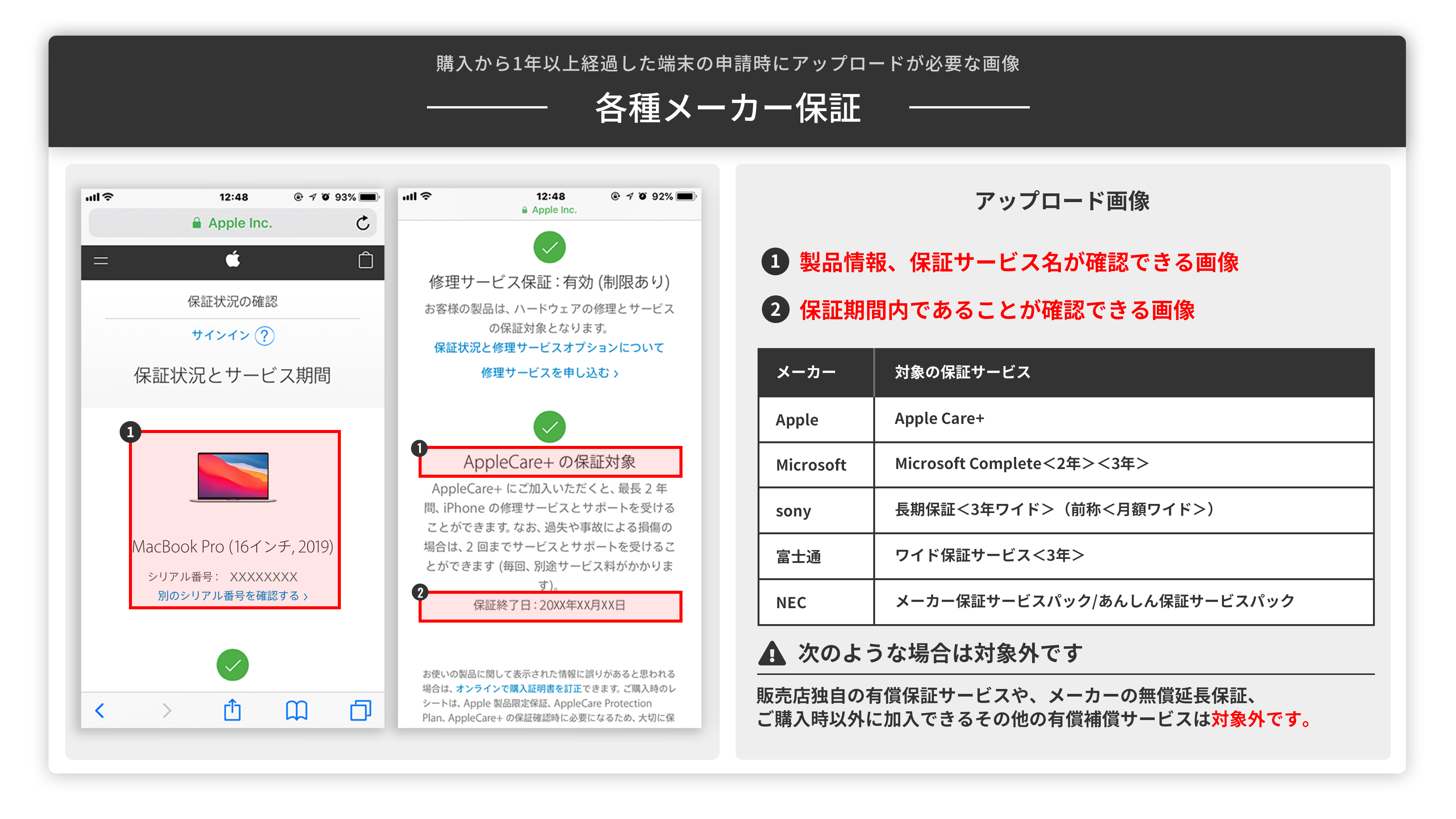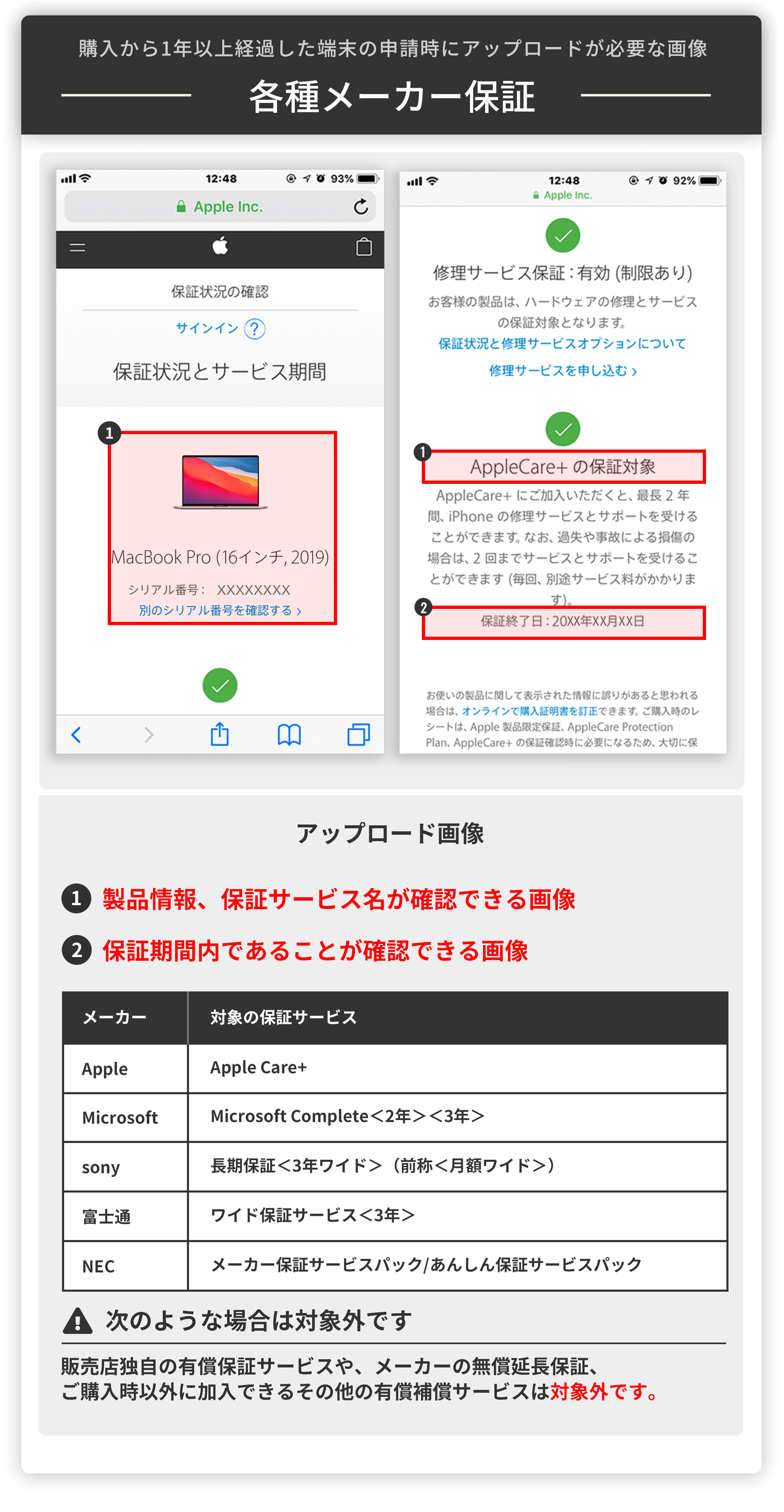 新規取得から1年を経過している端末は、メーカーまたは通信キャリアが提供する有償補償サービスに加入中で、かつ当該サービスにより補償が受けられる状態にあればお申込みが可能です。